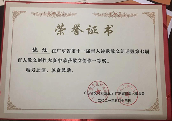 在诗歌朗诵决赛中,盲人选手施旭朗诵的《我喜欢出发》和王俊朗诵的《党的光辉照我路》荣获诗歌散文朗诵决赛优秀奖。