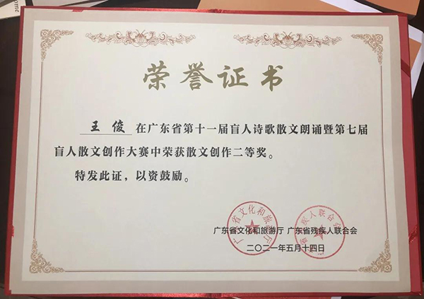 我市推荐的五篇散文作品荣获广东省第十一届盲人诗歌散文朗诵大赛决赛暨第七届盲人散文创作大赛一等奖、二等奖、三等奖和优秀奖。分别是一等奖作品施旭的《白手杖日记》;二等奖作品王俊的《我的光明路》;三等奖作品杨宙熙的《我心归处沐暖阳》;优秀奖作品是杨建华的《嘱托与使命》、梁飞龙的《游西溪湿地公园》。