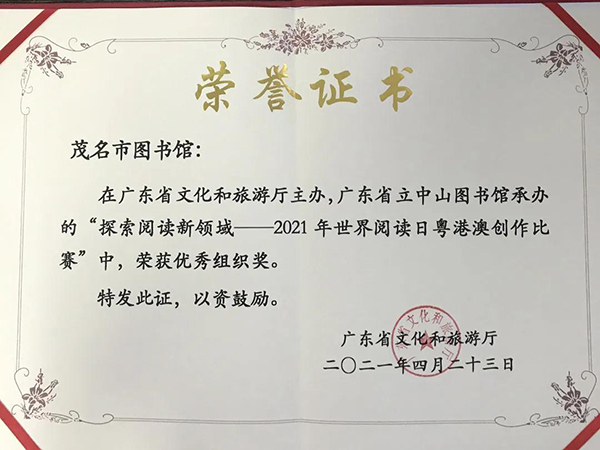 喜报!!!广东省文化与旅游厅主办的2021年世界阅读日粤港澳创作比赛赛果揭晓,茂名市图书馆荣获优秀组织奖!