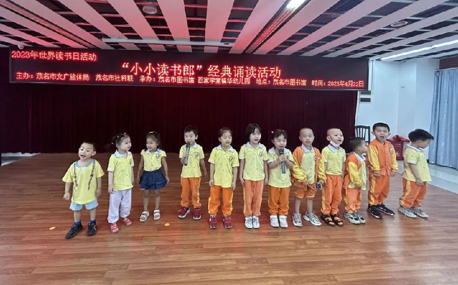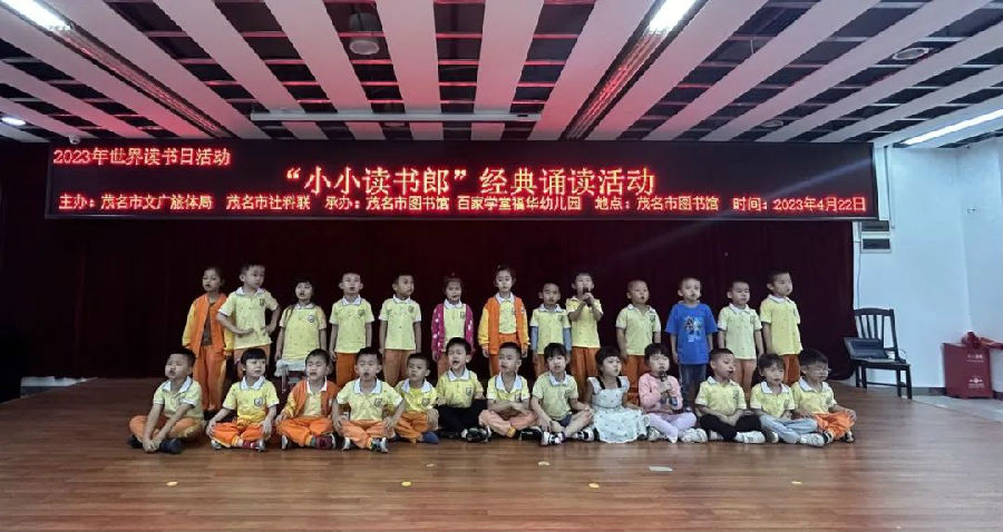 为进一步弘扬民族传统,传承国学经典文化,引领少年儿童通过诵读经典诗词,培养他们热爱祖国等优良品质,2023年4月22日上午,由茂名市文广旅体局、茂名市社科联主办,茂名市图书馆、百家学堂福华幼儿园承办的“小小读书郎”经典诵读活动在市图书馆四楼大会议室开展,受到了小读者们的欢迎。