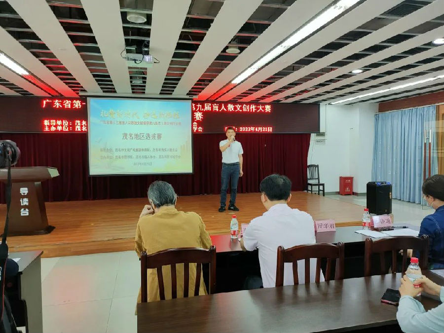比赛开始前,茂名市图书馆馆长周华君诚挚地感谢合作单位、社会组织的大力支持,她说盲人诗歌散文朗诵暨盲人散文创作大赛,是广东省视障读者一年一度的文化盛事,茂名的选拔赛也是2023年茂名市全民阅读系列活动的重要组成部分。希望在参赛者的带动下,未来会有更多视障人士参与进来,从阅读中汲取力量,用语言和文字展示积极向上的生活风采。
