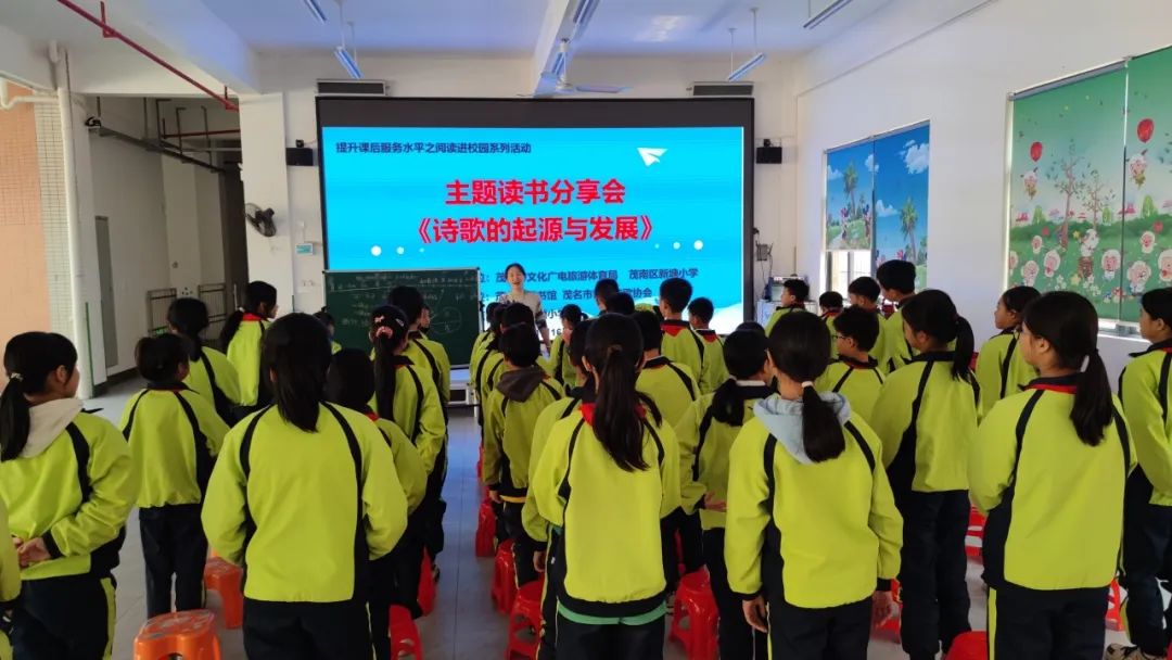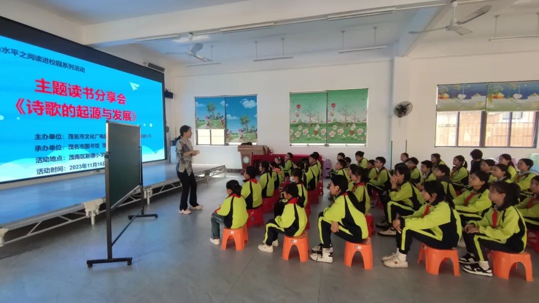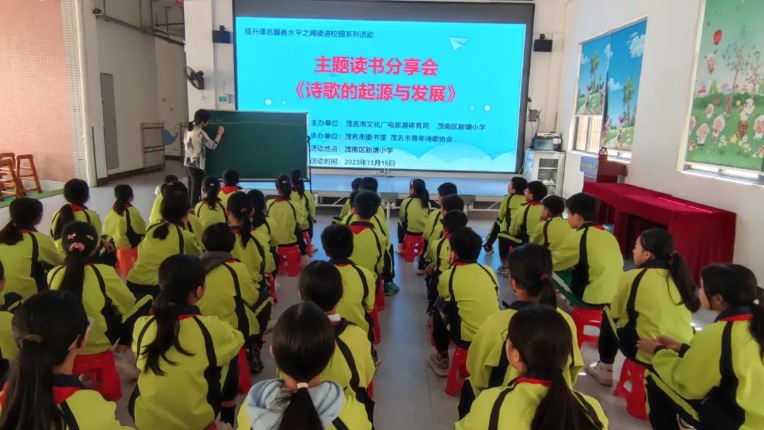 为深入推进全民阅读活动的开展,营造“多读书 读好书 好读书”的良好氛围,进一步弘扬民族传统,传承国学经典文化,2023年11月16日上午,由茂名市文化广电旅游体育局、茂南区新塘小学主办,茂名市图书馆和茂名市青年诗歌协会承办的提升课后服务水平之阅读进校园活动在茂南区新塘小学开展,受到了学校师生的欢迎。