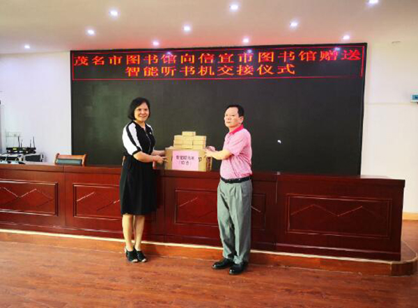 一部具有上网功能的听书机,可以轻松帮助盲人朋友打开阅读大门,4月19日上午,茂名市图书馆、信宜市图书馆在信宜市绍秀图书馆联合启动了盲人数字阅读推广活动。茂名市图书馆负责人周华君、副馆长李晓瑜向信宜市图书馆派发智能听书机。