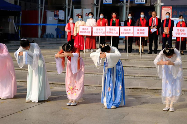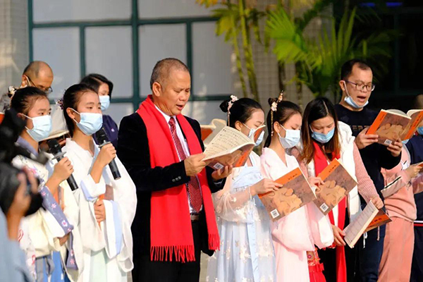 活动持续一个小时,主要分为六个流程:1.面向国旗,奏唱国歌。2.社会主义核心价值观行动宣誓。3.面向孔子圣像,礼拜圣贤。4.面向父母,礼拜父母。5.齐诵论语一、二、四篇。6.古典舞表演《厚德载物》。活动精彩纷呈,线下图书馆主会场人数受疫情防控要求,约30人参与现场活动,线上分会场直播在线参与人数超1.2万人次。