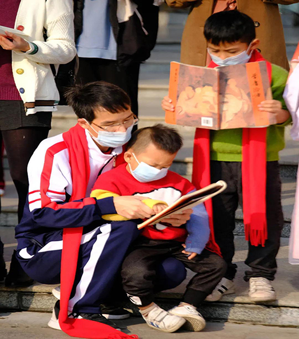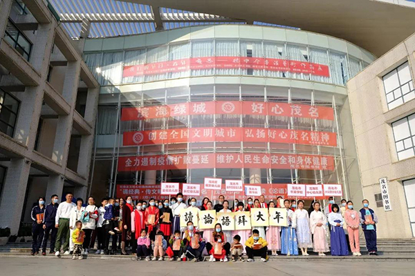 为了践行社会主义核心价值观,丰富市民读者春节假期文化生活,建设书香中国,书香茂名,好心茂名,全面提升公民素质和社会文明程度,2021年2月11日大年初一上午8:50分,茂名市图书馆联合茂名市华英学校在图书馆一楼共同组织开展了以“读经典、传文明,建设书香茂名”为主题的茂名市第一届“读《论语》 拜大年”活动。为了既能做好疫情防控工作,又能让更多市民参加活动,本次活动采用线上线下相结合的方式,线下设在茂名市图书馆门前举行活动,线上市民通过网络直播的方式参与这次活动。