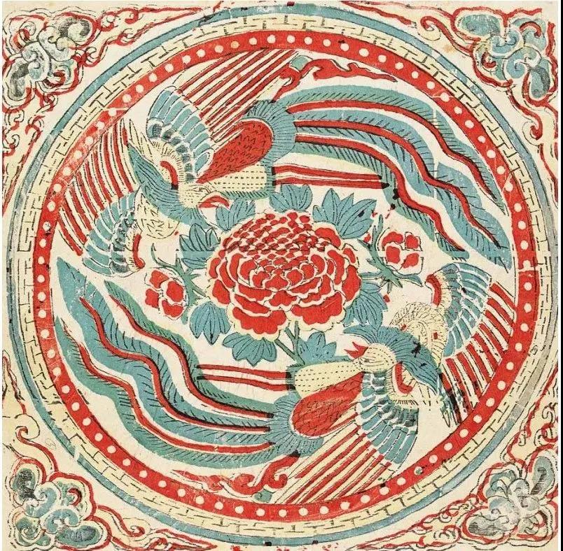 画面为正方形,中套以大圆,四角配以蝴蝶云纹图案;大圆中有双凤戏牡丹,寓意生活美满幸福。这是一幅贴在新婚夫妻洞房顶棚上的风俗画。