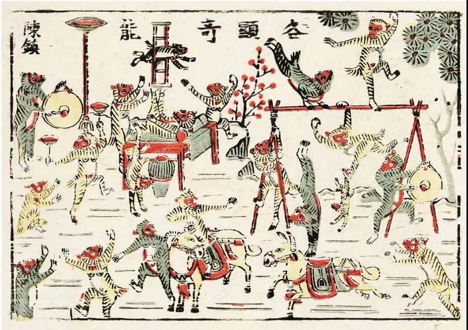 画面上群猴在表演杂技,它们利用各种器械,做出各式高难度的动作,个个演技娴熟,活泼可爱,令人赏心悦目。这是一幅幽默有趣的年画。