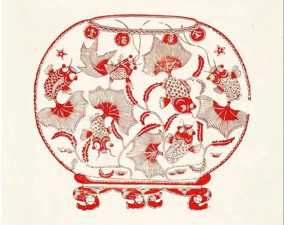 此画为朱色单版,画面既结构严谨,又活泼灵动,颇似剪纸。金鱼谐音金玉,表达对家庭富足的追求。