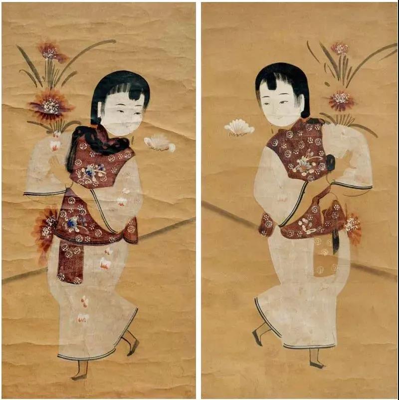 《踢毽子》(扑灰手绘,清代,高密 万聚永画店李云香画,高密市文化馆藏,100×50cm)