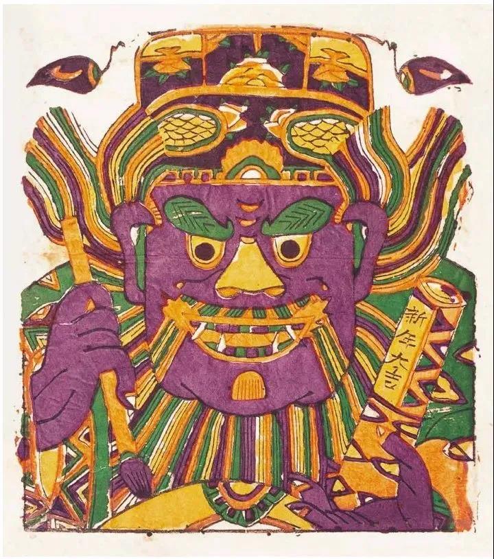 此幅锺馗仅表现头部,更给人以鲜明印象。锺馗戴判官翅纱帽,紫面獠牙虬须,狰狞威猛,一手执笔,另一手拿卷轴,上写“新年大吉”四字。此系在门楼上端或大门内迎面影壁墙正中贴用,以驱邪纳福。