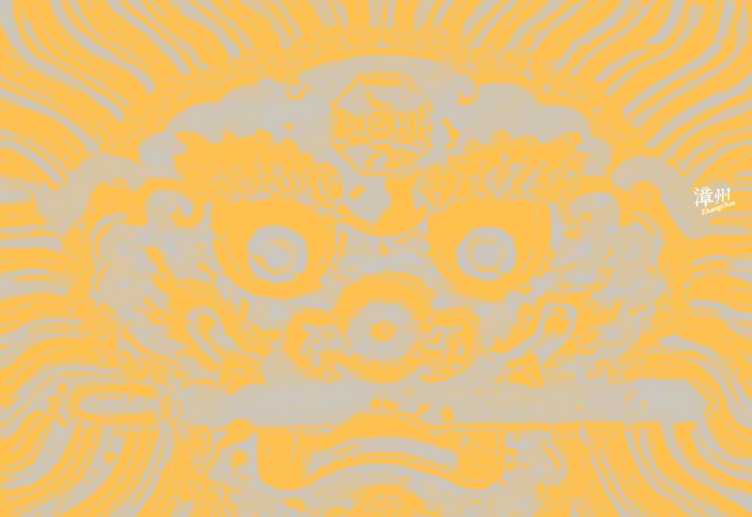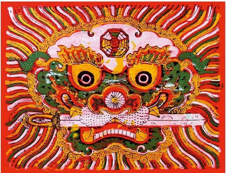 “狮头衔剑”又叫“狮咬剑”“八卦剑狮”,是闽南及台湾地区民宅常见的辟邪制煞的符镇物。画中狮头红眉圆目,五彩鬣毛飞张,双目圆瞪,赤口锯牙,口衔七星剑,额间印有八卦,十分威猛。此画为漳州年画代表作,多贴于大门门额或船舱门之上,人们希冀以此辟邪保平安。
