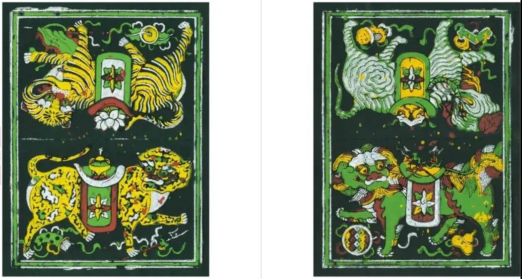 以黑纸印制的功德纸年画为漳州木版年画所独有,主要在道教法事活动中使用。道士行法时将此画折叠后供奉在香案上,法事完成后烧掉或张贴于寺庙墙上。画中为虎、豹、象、狮四种瑞兽,造型质朴,是漳州功德纸年画中的精品。
