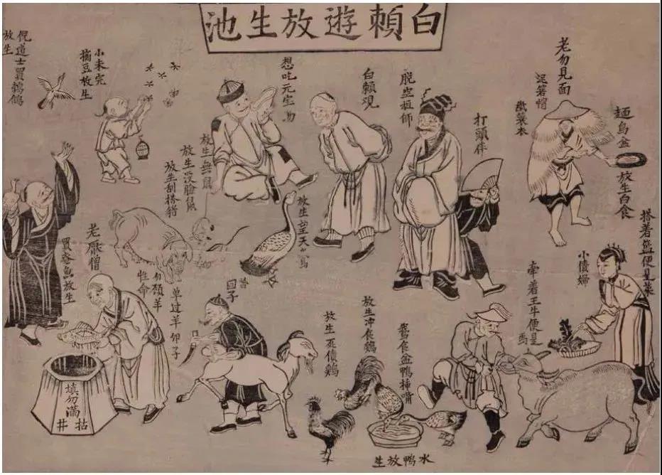 此为采用浓淡两种墨色来表现的滑稽画。画面上写着含有讽刺意味,引人发笑的文字。从画中女性的发型来看,应该是康熙晚期到乾隆初期的作品。本图描绘名为白赖的人去放生池游玩,看到了种种令人啼笑皆非的场面。画面左边,一名老僧正在将活鱼放进枯井里,画面右边站着一个负债女子来放生,手里提着的篮子里却没有生物,既滑稽又荒唐。