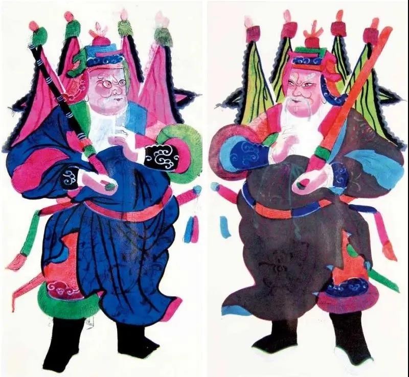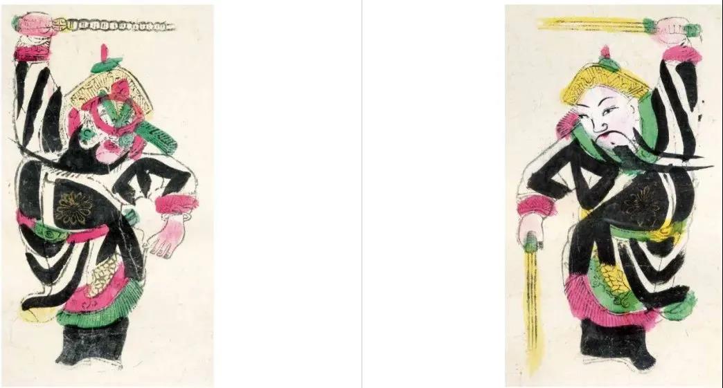 这是一对门画,画中尉迟恭头戴黑盔,右手执鞭,竖眉立目站于左;秦琼头戴金盔,怀中抱锏,面容和善立于右。二将相对肃立,威风凛然,人们相信贴在大门上可以阻止妖魔侵入。