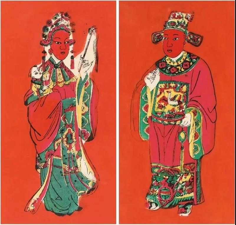 传统门神都是辟邪摧凶的武将,佛山木版年画这一男一女的门画十分独特——把“状元”(人)和“天仙”(神)并列起来,这是十分了不起的。这反映了人们不再惧怕神鬼,同时急于提升自己生活品位的心态,是佛山木版年画中非常独特的作品。这对门画,在新婚或年轻夫妇房门之上张贴。寓意男的高中状元,女的早生贵子。期望孩子长大后必状元高中,加官进爵,富贵一生。画面以大红为背景,热烈又吉庆。