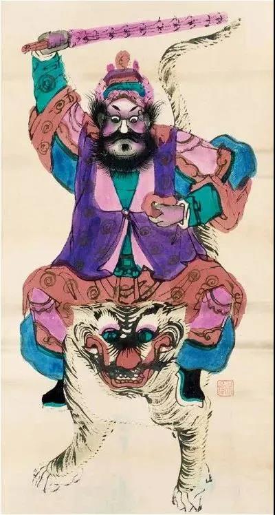 “玄坛”即“赵公元帅”。此画色彩以湖蓝、鲜紫、粉红相搭配,为佛山年画所特有。