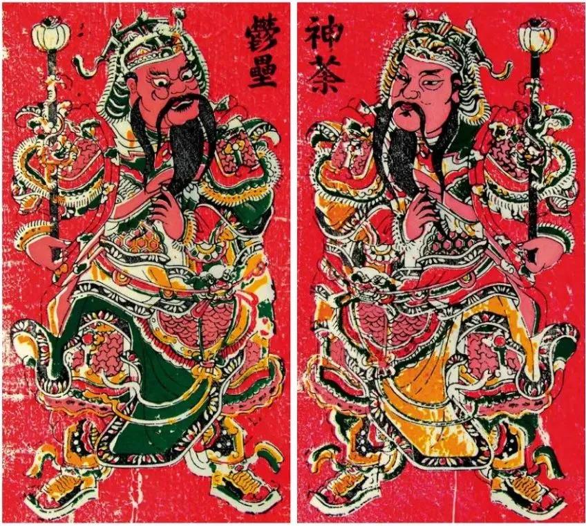 漳州门神年画可分为“幼神”和“粗神”两种。印在万年红纸上的为“粗神”,印在玉扣纸上并套印红色底色的为“幼神”。此对《神荼·郁垒》属“幼神”年画。画中人物刻画精致,表情生动,服饰古朴,造型大方丰满,为此类年画中的精品。