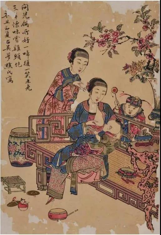 《慈母哺乳闺门画》(套版,清代·光绪辛丑年(1901),上海小校场 古吴梦蕉作,上海历史博物馆藏,46.5×32cm)