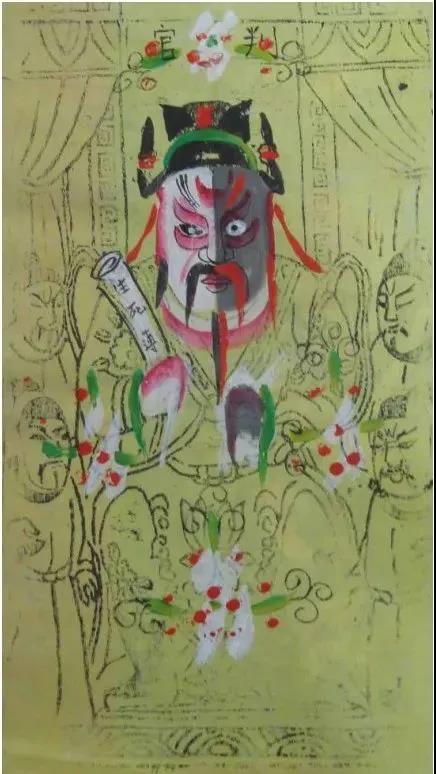 判官为佛系纸马中的一位,他手执“生死簿”,面为阴阳脸,其形象与职掌相互映衬,有一定的视觉冲击力。该纸马以墨线版印为主,但面部施以彩绘,保持了无锡纸马面实身虚的传统。