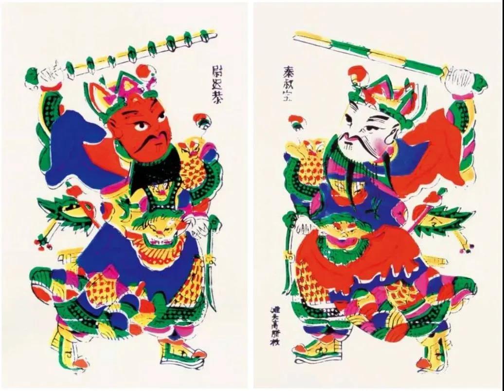 此乃门神一对。一个红脸,佛青袍,另一个白脸,朱红袍。秦叔宝持锏,尉迟恭执鞭。智能的秦叔宝采用山羊胡,勇武的尉迟恭采用络腮胡。对比又对衬,极具美感。