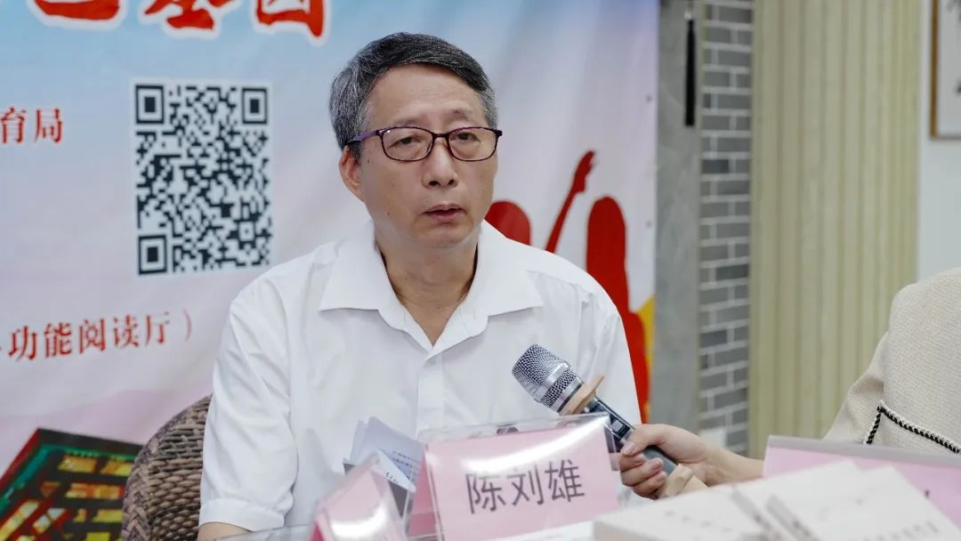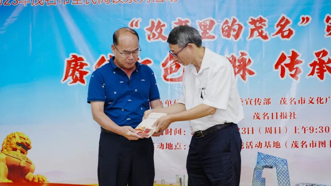 访谈结束后,陈刘雄向茂名市图书馆赠送他主编的图书《李卡烈士遗作集》。茂名市图书馆副馆长许日正代表图书馆接受赠书。