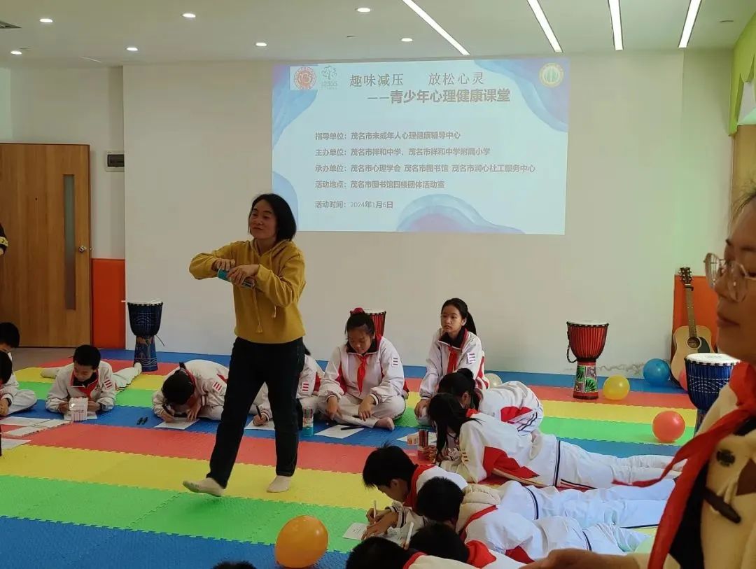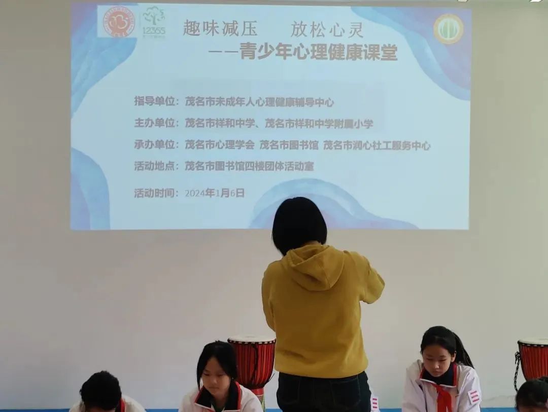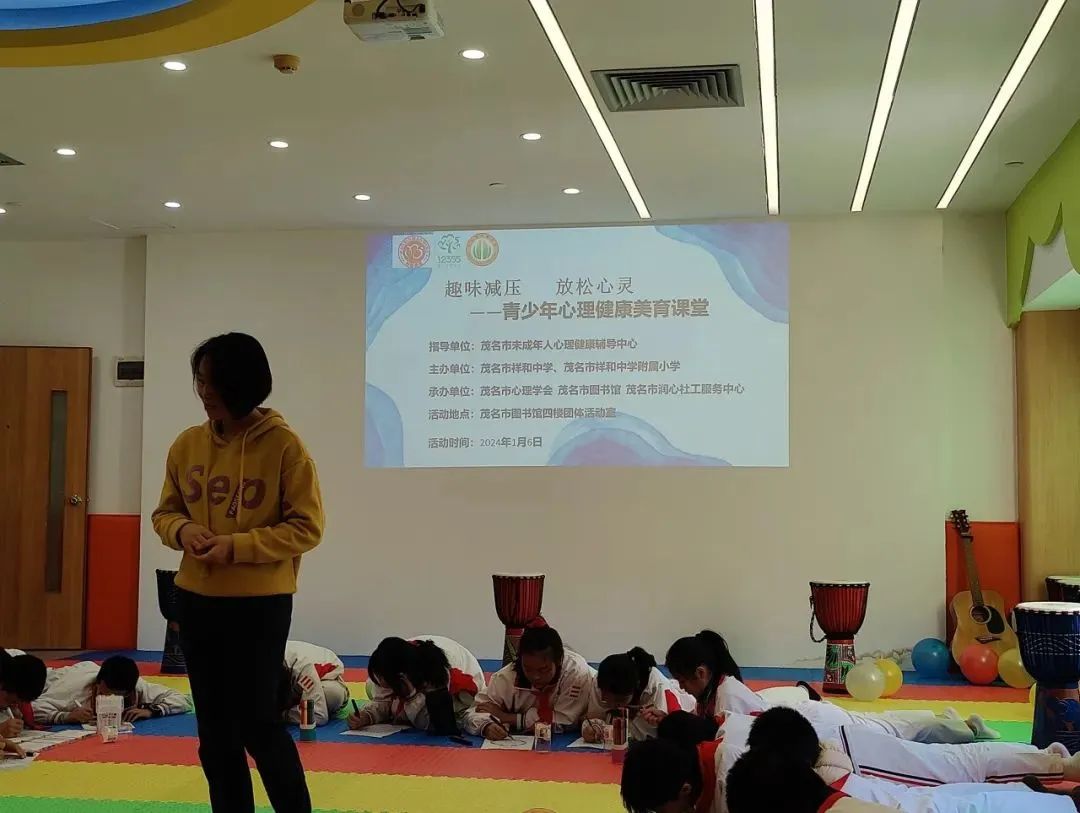 2024年1月6日,在茂名市未成年人心理健康辅导中心的积极协助下,由茂名市祥和中学、茂名市祥和中学附属小学主办,茂名市心理学会、茂名市图书馆、茂名市润心社工服务中心联合承办的“趣味减压放松心灵--青少年心理健康美育课堂”在茂名市图书馆四楼团体活动室顺利开展。