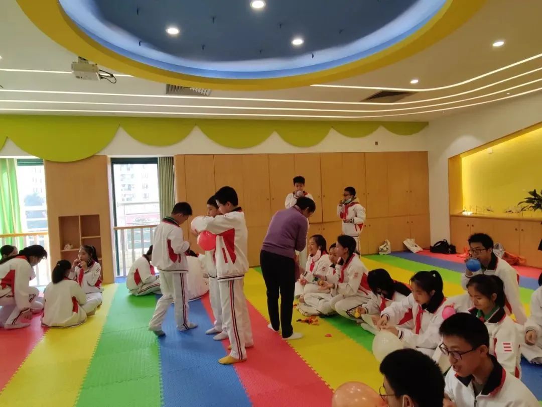在“爆破烦恼气球”游戏中,柯老师让同学们排成三列,进行夹球前进游戏,这个游戏的目的是锻炼同学们的团结意识,也让同学们明白,自己刚刚吹的气球会影响到自己接下来的动作,让同学们明白选择的重要性。