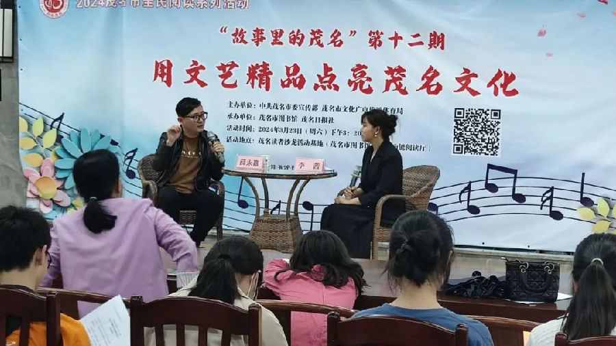 3月23日,由中共茂名市委宣传部、茂名市文化广电旅游体育局主办,茂名市图书馆和茂名日报社承办的文化栏目“故事里的茂名”第十二期:用文艺精品点亮茂名文化精彩开讲,广东省鲁迅文艺奖获得者薛永嘉与现场观众一起分享精彩的音乐故事和创作心得。活动通过新华社现场云直播,线上线下超过6万人次聆听了访谈。